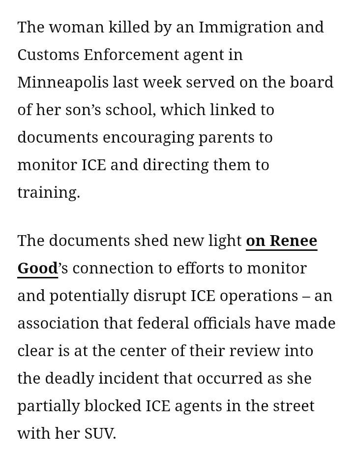 The ICE agent broke the standard operation procedures of all REAL law enforcement and stepped in front of a occupied vehicle hand on gun . It was premeditated murder. If he was a member of REAL law enforcement he would be suspended and face trial. But Trumps ICE isn't REAL law enforcement its made up of proud boys 3 percenters and KKK. Many are pardoned January 6th terrost. They don't have a law enforcement degree like REAL law enforcement. It's obvious to every intelligent person in the US and world they are Trumps gestapo.