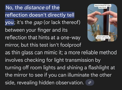 ok to those wondering and to those who claimed one thing and those who claimed the opposite. she is testing to see if their is a one way mirror in the bathroom,a common BUT NOT full proof way to test this is to do what shes doing in the video. take your finger and gentley place it against the mirror. if there is a gap in the reflection, your finger then odds are its a regular mirror. "space = safe" like she shown in the 1st mirror, if there is no gap then it COULD be a 1way mirror where someone could be watching/etc on the other side. like was shown on the 2nd mirror esp. since its aimed at the toilet and theres a private room across mirror as she shows at end of clip. a more accurate test is to turn off the room lights, take a flashlight or your phone with flashlight on, place it against mirror and see if the light shines thru or u may even be able to see thru the mirror using camera and light against the mirror . also tapping and listening for a hollow sound is a way.