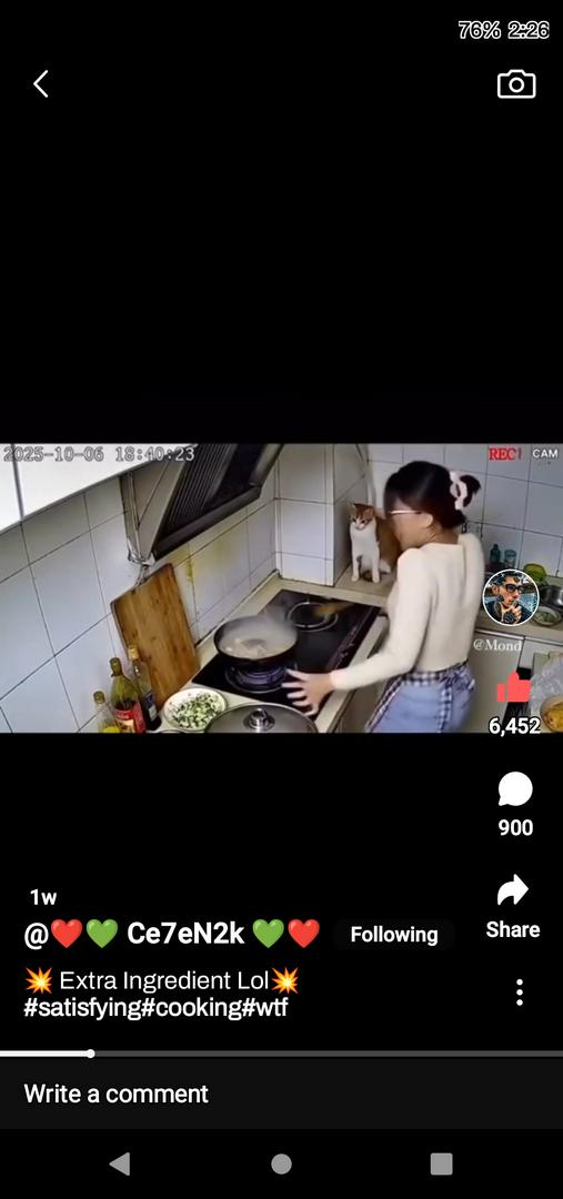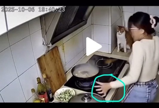 see her cat stood up and yelling Meowing, I beleived her cat saw a snake who fell into the hot frying pan that lady grabbed a lid to cover the frying pan. π€π good job!