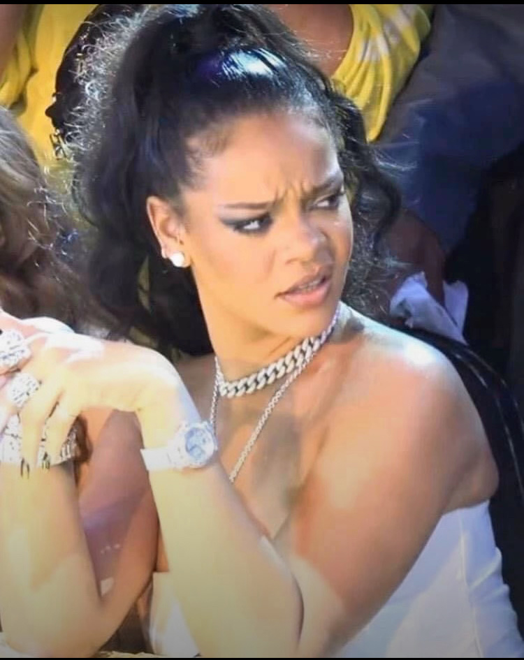 You all are DELUDED. What in the hell are you looking at? Rihanna is mad as hell. Typical mean girl, and you guys are whitewashing her behavior, including those ugly facial expressions, calling it something that it's not. It is NOT praise!! It's fine to be a fan, but don't be IGNORANT.