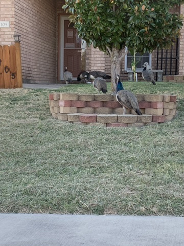 Yesterday my husband and I went to the store. We have wild peacocks in the living area. Approaching the house I saw one with his beautiful feathers on top of our house as if he was an ornament we placed up there. Every once in a while u will look outside and occasionally we will have anywhere from 1-8 peacocks out front. Some of our neighbors feed them. They come up and eat the cat food we put out for cats.