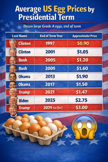 In Florida, eggs are $4.06 for farm fresh eggs at Publix, gas is $2.76 a gallon, the secured border is a bonus!