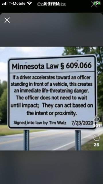 FEDERAL OFFICERS DO NOT FOLLOW STATE LAW There is no Minnesota law enacted by Gov. Tim Walz that says officers may automatically shoot a driver simply because the car is moving toward them. That precise wording does not appear in the statute, and Walz did not sign such language into law.