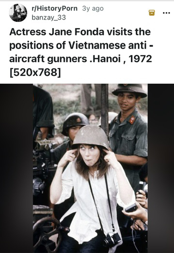 “In 1972, actress Jane Fonda visited North Vietnam as part of the anti-war movement, where she toured bombed sites, spoke on Hanoi Radio condemning U.S. actions, and was famously photographed sitting on an anti-aircraft gun used against American planes, earning her the nickname "Hanoi Jane" and widespread condemnation as a traitor from many Americans and veterans. Her actions, including voicing support for North Vietnam and allegedly cooperating with POWs, were used as propaganda by the North Vietnamese and deeply angered U.S. soldiers and the public, though she later expressed regret for the perception that she was against the soldiers themselves.” NEVER FORGET, Hanoi Jane!