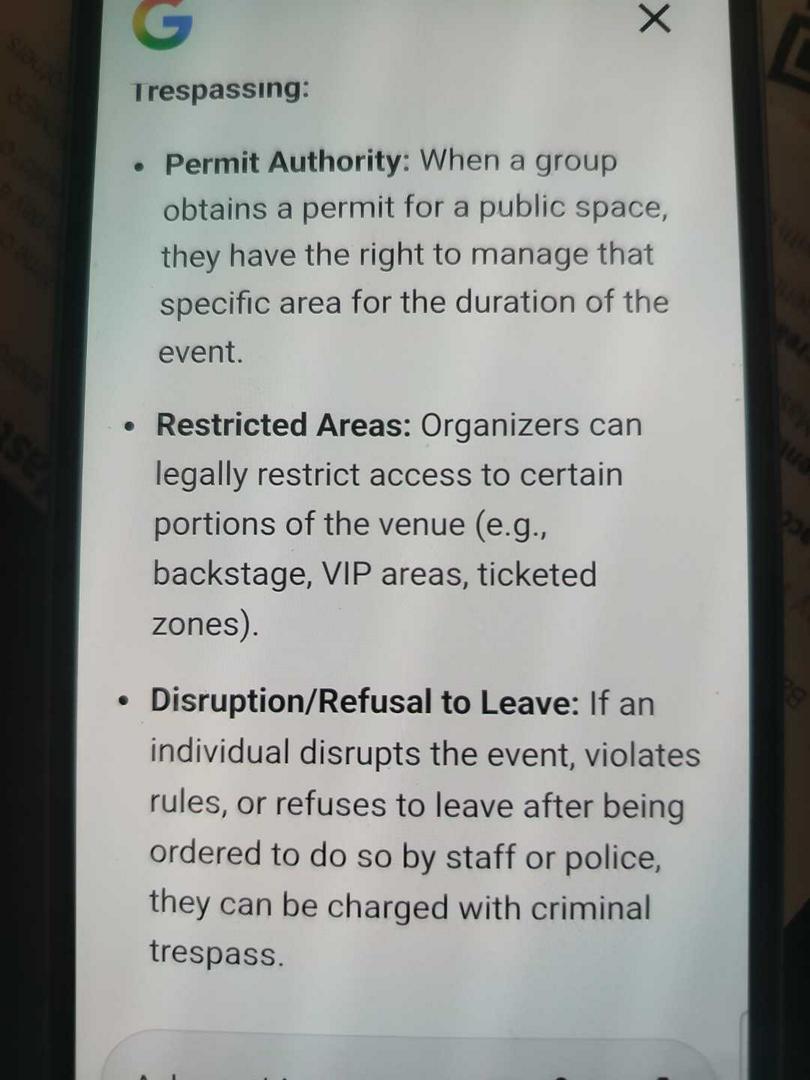 You go girl!!! Permitted events are just so the petitioner can hold a PRIVATE event in a specific PUBLIC area โฆit doesnโt give ANYONE the authority to arbitrarily remove or trespass someone who chooses to attend. The โfine lineโ they would have to walk is if someone complains that youโre causing a disturbance by impeding or disrupting the general public In the event. To dismiss any complaint(s),I think a great idea would be to PURCHASE ANYTHING from one of the vendors at the event and their argument is OVER. At that point you would become a participating customer/citizen in the permitted event. Any further action on their part would be CRUSHED in courtโฆ.Carry on and do your thing girl! ๐๐ป๐ซก๐บ๐ธ