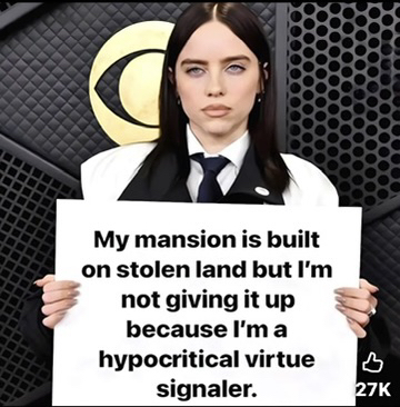 then give up the stolen you bought billie. celebrities need to keep their mouths closed about politics. nobody cares about their opinions. they are there to entertain us. not shove woke leftists propaganda in our faces.