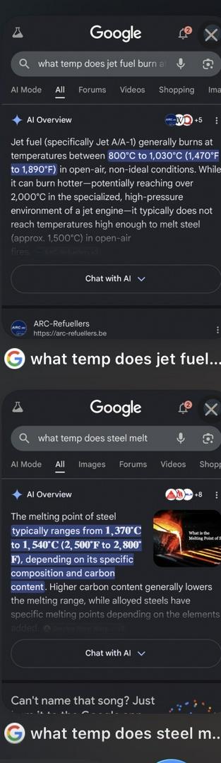 Steel melts at 2560-2900f and jet fuel burns at 1500-1800f