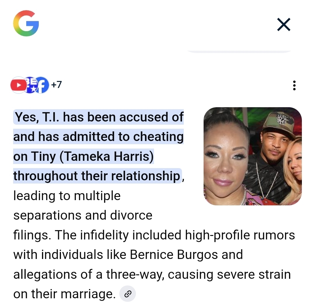 Everybody all mad and all this other stuff talking about yeah they defending they mama and blah blah BLAH, but guess what why them kids ain't sitting there go after their daddy TI and do a rap video or blow AT him, when he was sitting here disrespecting their mama who they said they love so much???!!! Don't want nobody to disrespect her right? That was the biggest disrespect of all I mean he literally was openly cheating on her and showing how she ain't nothing, she ain't love like how he claiming he love her. Ohh, but 50 the problem?! 🙄🤔😂😂 50 Cent just talked facts and he just talk real things that people are too scared to say. How can TI call 50 a coward when if that's not more cowardly a man who sit there and can't even be real and tell his wife that he cheating on her he has to do it behind her back and then humiliate her and then he probably made her feel bad like she did something wrong for him to go and do that and can't own up to the fact!!