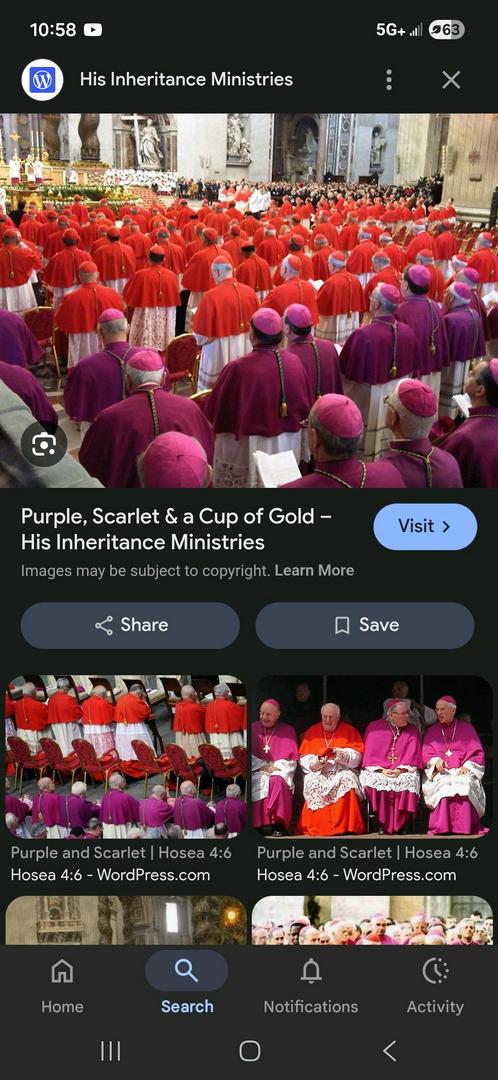 Revelation 17:4-6 King James Version 4 And the woman was arrayed in purple and scarlet colour, and decked with gold and precious stones and pearls, having a golden cup in her hand full of abominations and filthiness of her fornication: 5 And upon her forehead was a name written, Mystery, Babylon The Great, The Mother Of Harlots And Abominations Of The Earth. 6 And I saw the woman drunken with the blood of the saints, and with the blood of the martyrs of Jesus: and when I saw her, I wondered with great admiration.