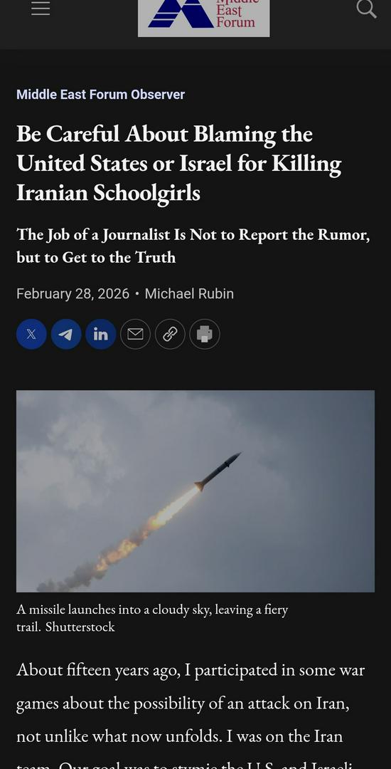 Be Careful About Blaming the United States or Israel for Killing Iranian Schoolgirls The Job of a Journalist Is Not to Report the Rumor, but to Get to the Truth February 28, 2026 Michael Rubin "About fifteen years ago, I participated in some war games about the possibility of an attack on Iran, not unlike what now unfolds. I was on the Iran team. Our goal was to stymie the U.S. and Israeli assault by any means possible, especially given the West’s clear qualitative military edge. We detonated a bomb at a local school and then brought in Iranian film crews to view the carnage. We then sent press releases across the globe announcing a U.S. massacre of Iranian children with a goal to invigorate the progressive left and erode support for any anti-Islamic Republic campaign among centrist diplomats."