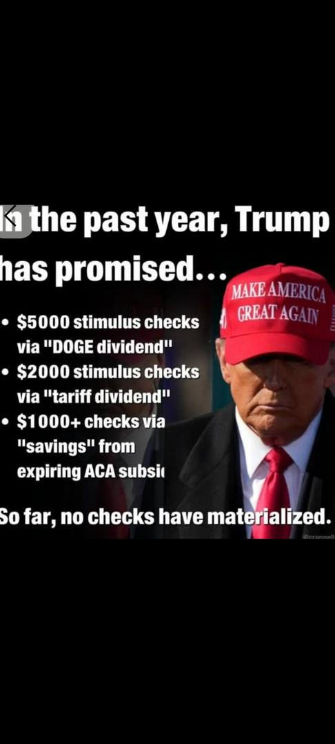 Like those DOGE checks? Like the checks he promised last year? Like how the tariffs wouldn’t affect us? Like grocery prices would fall? Like the East Wing wouldn’t be touched? Like only criminals would be deported? Like America needs to stay out of foreign wars? Like he’s the president of peace? What a scam! Liar. Felon. Rapist. Pedophile?. Rapidly losing brain function. A great loser as a decent person.